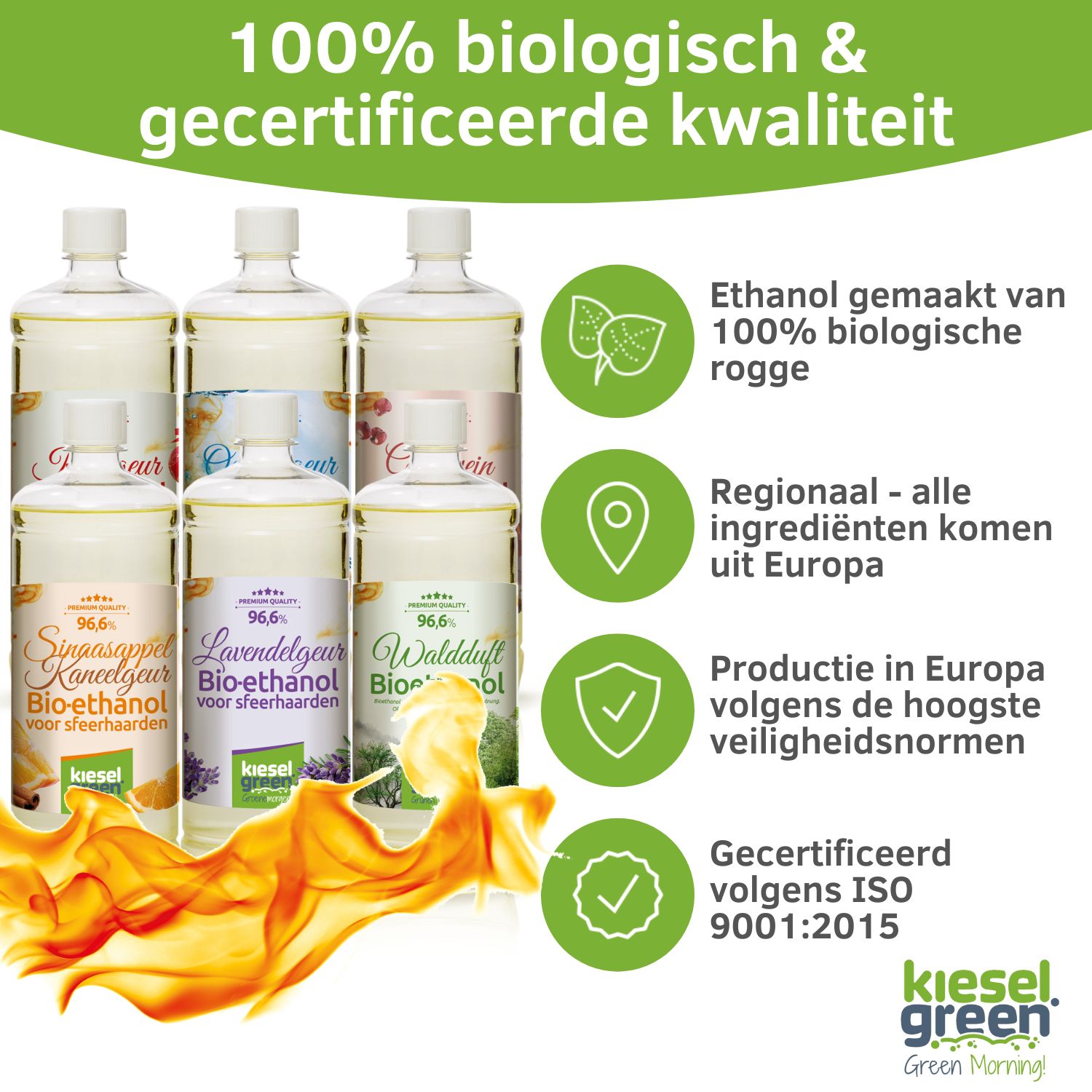 De bio-ethanol is 100% biologisch en wordt in Europa geproduceerd, met een focus op duurzaamheid en kwaliteit.