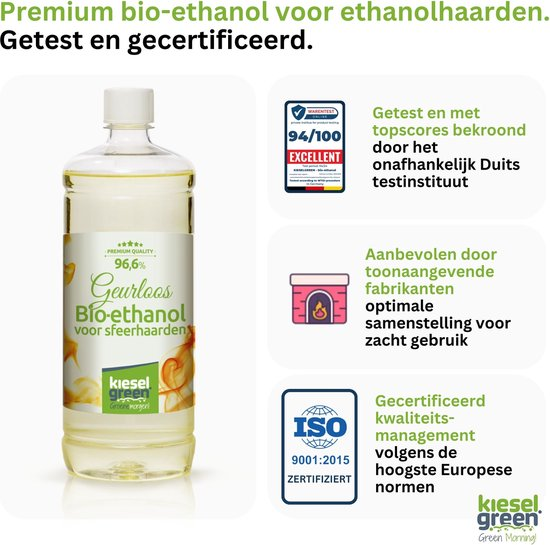 - Duurzaam Geproduceerd: Bio-ethanol vervaardigd in Europa volgens ethische normen en strenge kwaliteitscontrole, met TÜV- en ISO 9001-certificering.