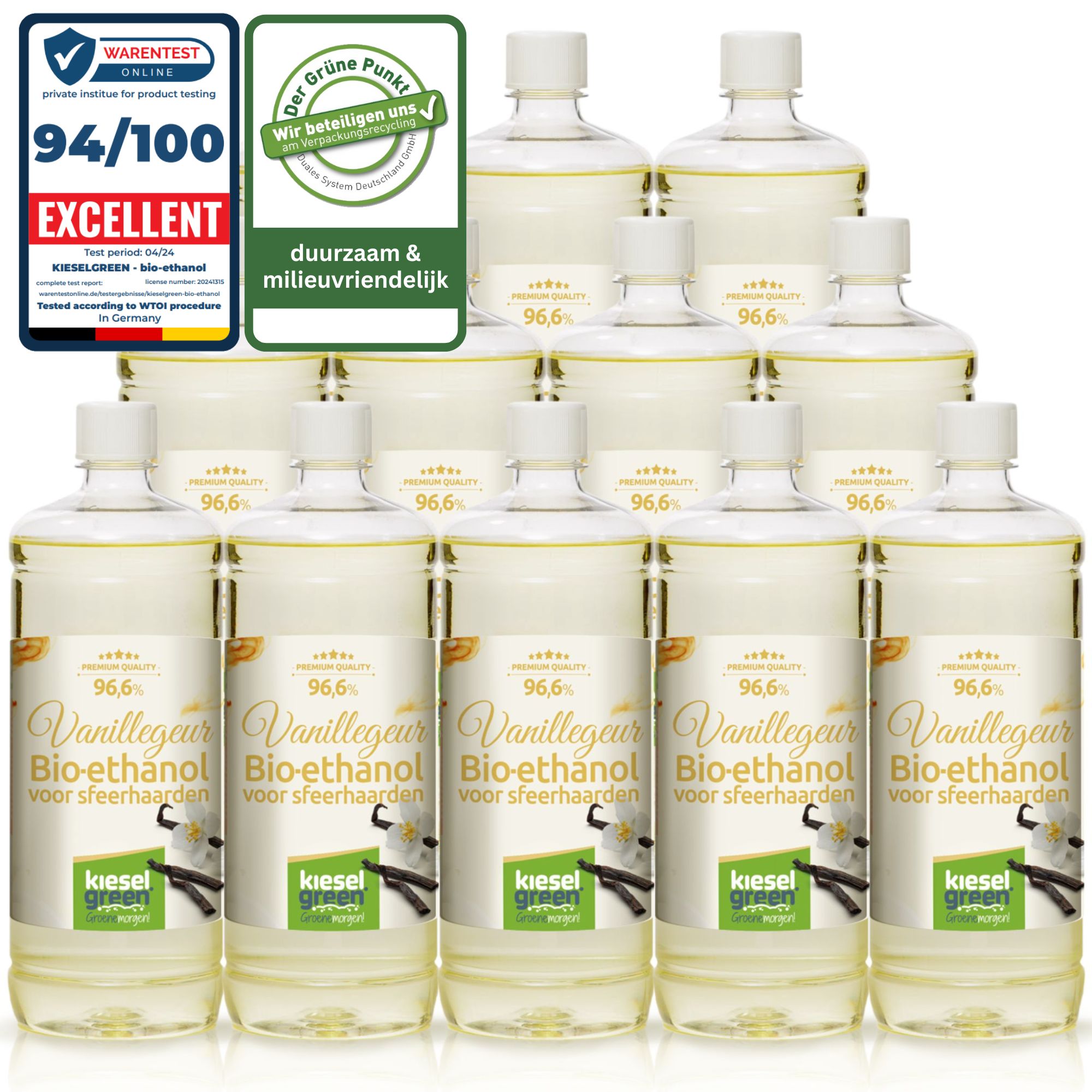 - 12 flessen van 1 liter KieselGreen Bio-ethanol Vanillegeur
