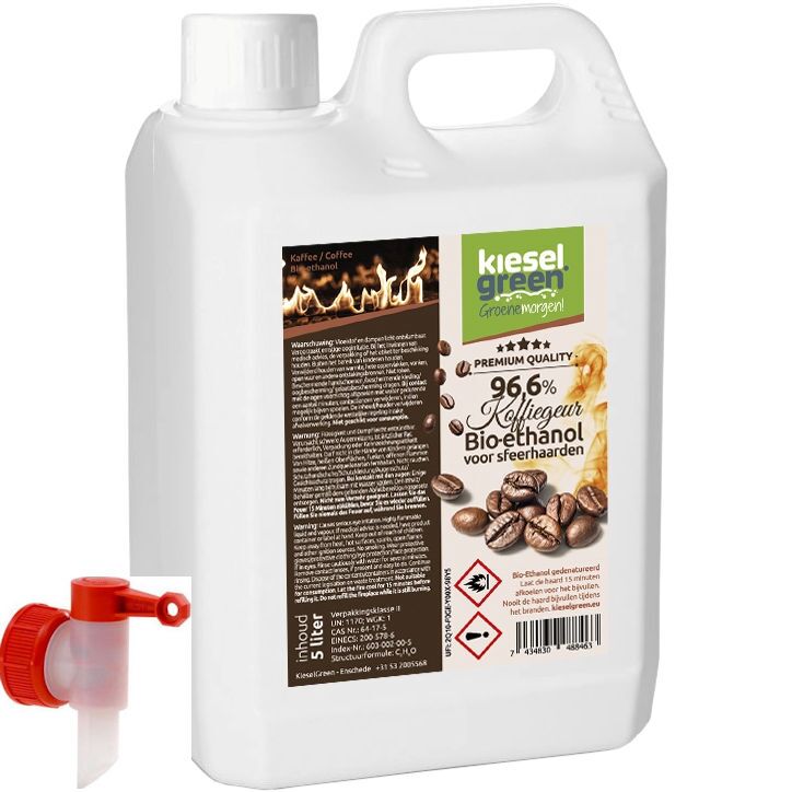 Bij je bestelling ontvang je één jerrycan van 5 liter KieselGreen Premium Bio-Ethanol met Koffie Aroma. De verpakking bevat een handige spuitkop, waardoor het vullen van je haard moeiteloos en veilig verloopt.