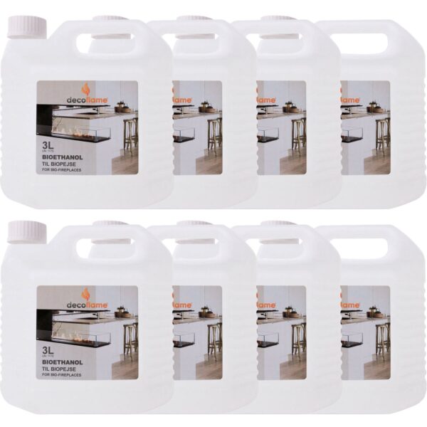 - 8 praktische jerrycans van elk 3 liter Decoflame Premium Bioethanol 96,6%