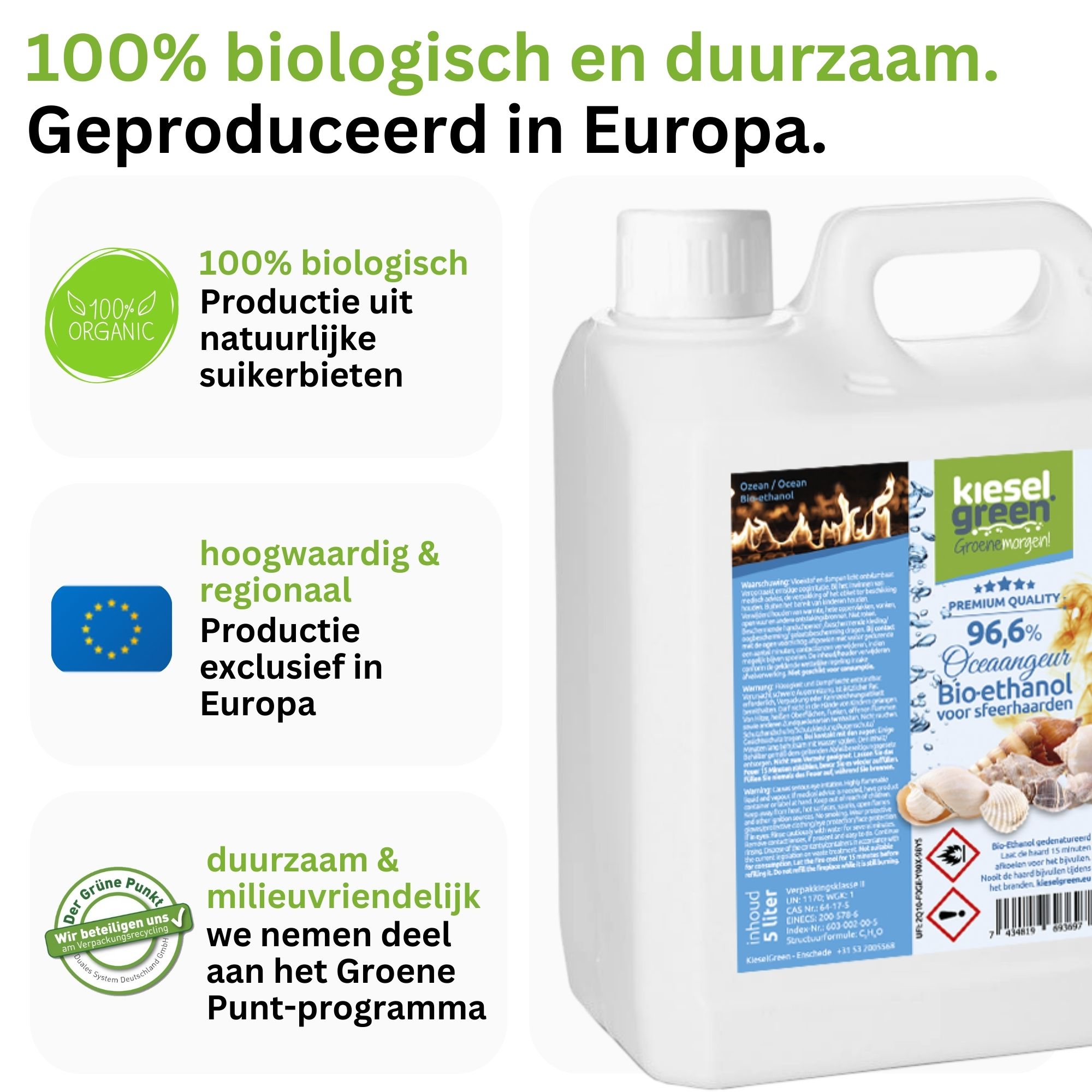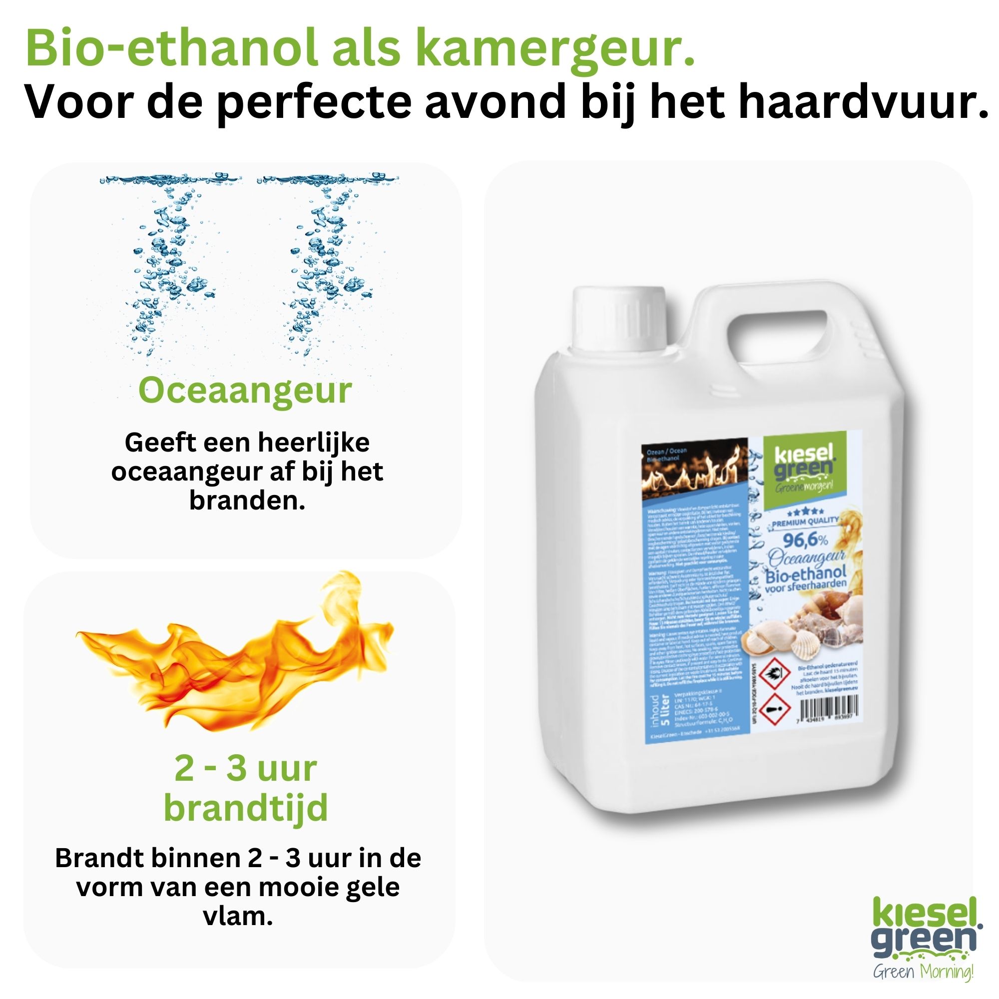 KieselGreen Premium Bio-Ethanol met Oceaan Aroma biedt een unieke combinatie van kwaliteit, veiligheid en milieuvriendelijkheid. De frisse, ontspannende geur van de oceaan brengt rust en luxe in je woonkamer. Perfect voor sfeerhaarden en tafelhaarden, met een schone en efficiënte verbranding.
