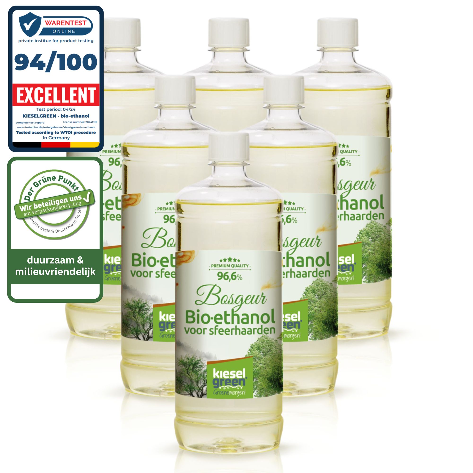 - Hoogwaardige bio-ethanol: Een zuiverheid van 96,6% garandeert een schone en veilige verbranding.